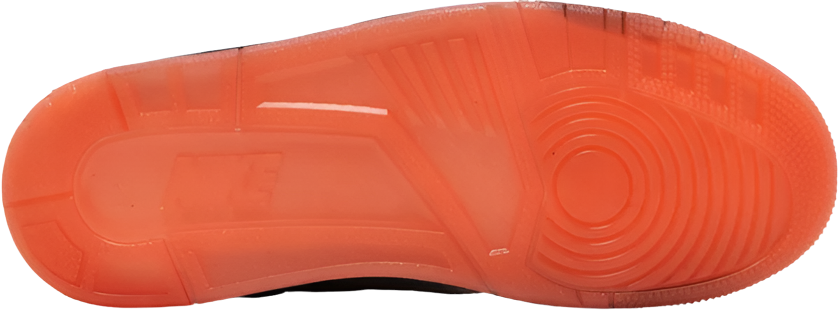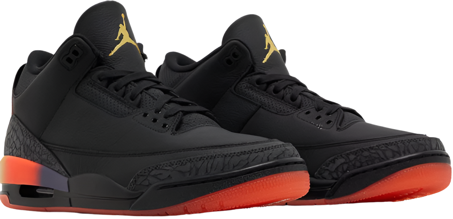 The J Balvin x Air Jordan 3 Retro 'Rio' takes its name from the reggaeton artist's son. The legacy silhouette carries a black leather upper with grey elephant print overlays at the forefoot and heel. Gradient accents in Solar Flare and Total Crimson Abyss coat the back tab, marked with Nike Air branding on the left foot and J Balvin's smiley face logo on the right. The sunset colors are repeated on the rear of the polyurethane midsole, supported by a red-tinged translucent rubber outsole.