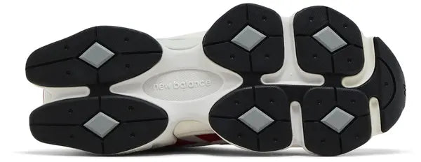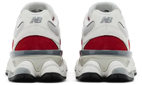 The New Balance 9060 'White Red' sports an off-white mesh upper with tonal leather overlays. Crimson suede construction is utilized on the mudguard and tongue, featuring a jeweled NB 9060 badge. Performance benefits include a translucent CR device at the heel, as well as a dual-density ABZORB midsole with SBS cushioning.